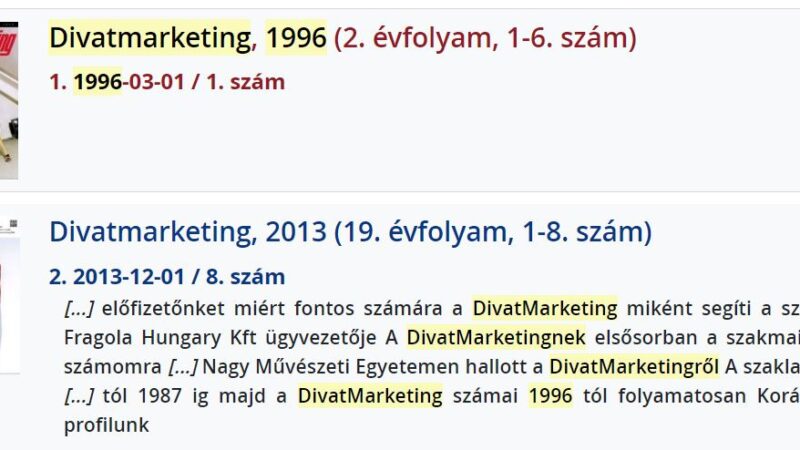 Ma felszállt a fehér füst, jelezték, hogy aktív az oldal, publikálták a DivatMarketingeket. A divatmarketing 1996 keresésre pl. ezek a kiadványok, oldalak jelennek meg: