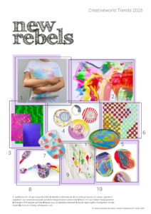 A new rebels a szabadság, az önkifejezés és a tudatos szabályszegés terepe. Festékfröccsenések, hologramok, 3D-hatások és olyan spontán technikák uralják, mint a csepegtetés, szórás és modellezés. A hagyományos műanyag fóliákat fenntartható alternatívák váltják fel, miközben a matricák, textilfestékek, a tufting és a műgyanta új lehetőségeket teremtenek. Még a hímzés is lázadóvá válhat – ha például a festékfröccsenéseket cérnával „varrjuk meg”.