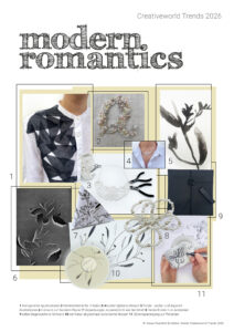 Törékenyen finom, részletgazdag és nosztalgikus – a modern romantics a klasszikus kézműves technikák újjáélesztéséről szól. Gyöngyhímzés, csipke kiegészítők és botanikus akvarellek költői bájt visznek a papírárukba, textíliákba és ékszerekbe. A személyre szabott csomagolások és a kivágásos megoldások többletjelentést kapnak, miközben a brossok visszatérnek. A rétegzettség, a vázlatosság és a tapintható anyagok kiemelik a stílus lágyságát és csendes érzelmességét.