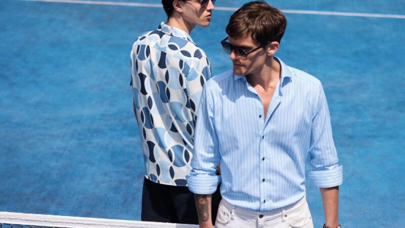 Kötött pólók nyári színekben, rövid gombolópánttal, valamint végig gombos len ingek és T-shirt-ök fiatalos színekben és mintákkal.